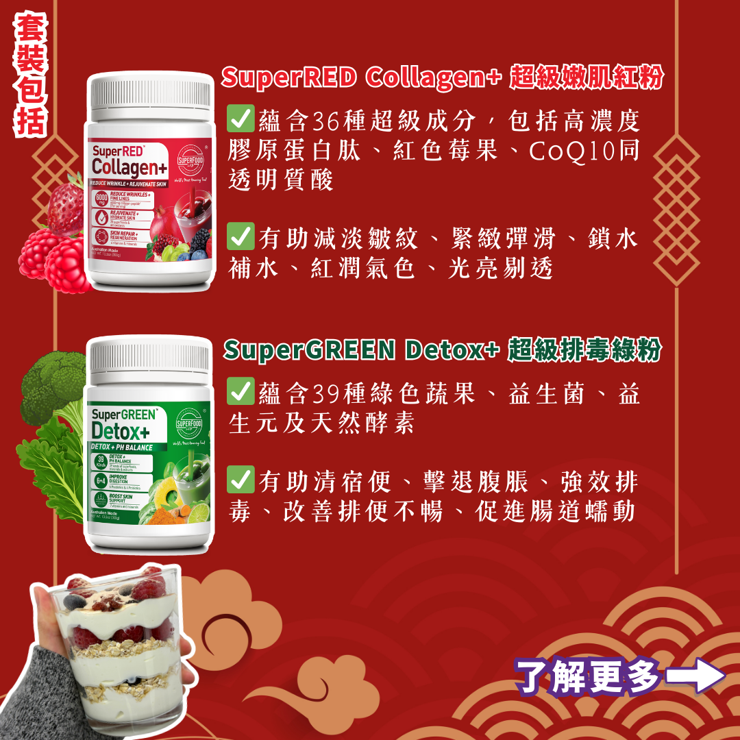 減肥最怕身形減極唔瘦又搞到面凹、肌膚冇光澤,真係好顯老😭!而SuperRED就係令你不一樣嘅關鍵!SuperRED含有36種超級成分,包括高濃度膠原蛋白肽、紅色莓果、CoQ10同透明質酸,為你減磅期間繼續容光煥發!