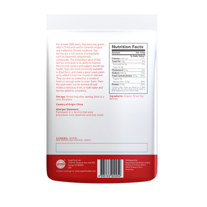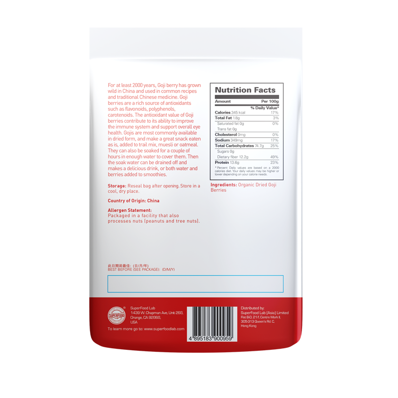 杞子廣泛於中國生長並為傳統中國長壽食品。擁有18種氨基酸及高抗氧化成份,如類黃酮,茶多酚和類胡蘿蔔素之豐富來源, 不含化學物質如農藥和重金屬。